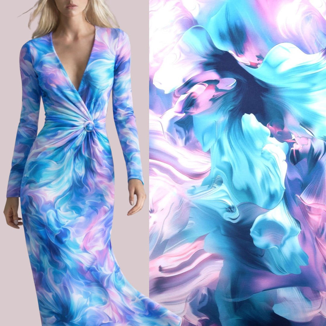 Funkcjonalna dzianina BODY PREMIUM z cyfrowym nadrukiem abstrakcyjnym. Nadruk cyfrowy jest bardzo wyraźny, trwały, ciekawy, nasycony kolorystycznie. Materiał jest przyjemny w dotyku, miękki, lejący i bardzo elastyczny, naddaje się we wszystkie strony, jest bardzo wygodny w noszenia na każdy dzień. Dzianina jest komfortowa, nie traci swojego koloru po wielku praniach, nie mechaci się oraz nie gniecie, posiada piękny połysk. Dzianina funkcyjna sportowa jest stosowana na stroje kąpielowe, gimnastyczne i taneczne, topy, koszulki i t-shirty sportowe, ale także legginsy oraz przylegające do ciała spódnice oraz sukienki. Idealna na odzież sportową.